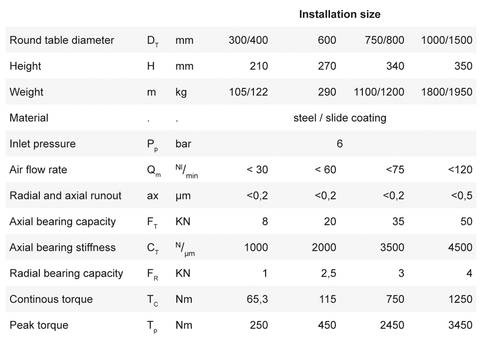 帶直接驅動的空氣靜力圓工作臺、組合徑向/軸向軸承、具有自潤滑性能的涂層滑移面、集成角度測量系統、集成轉矩電機,空氣冷卻。